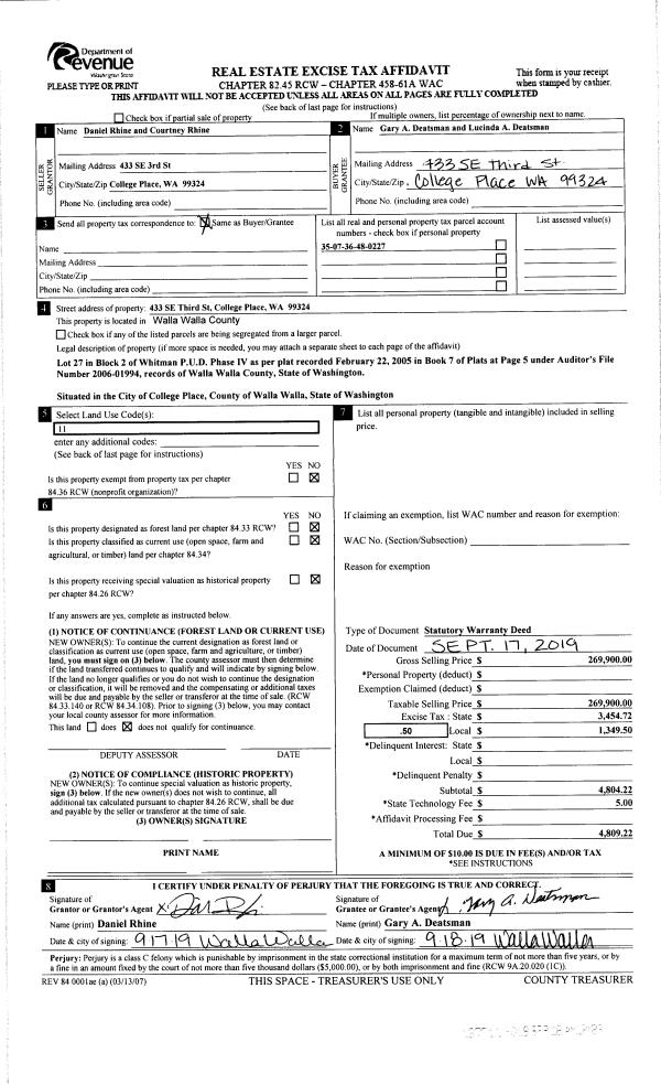 | 1 | 09/19/2019 | SWD | STATUTORY WARRANTY DEED | RHINE DANIEL & COURTNEY | DEATSMAN GARY A & LUCINDA A | | | $269,900.00 | 137711 | 2019-07323 |