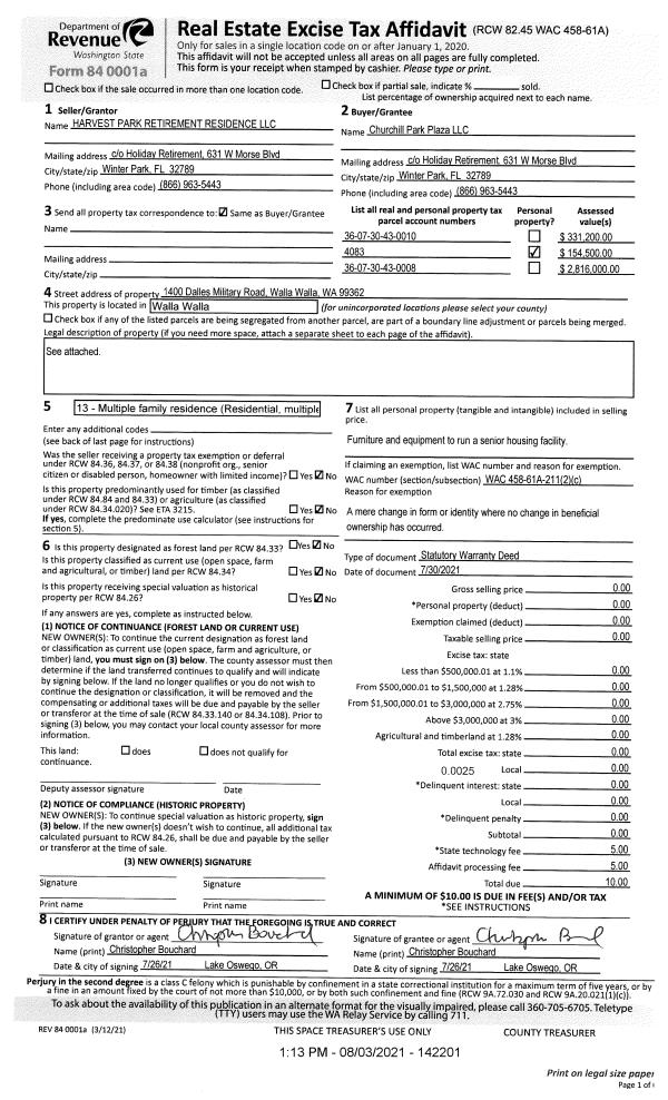 | 1 | 07/30/2021 | SWD | STATUTORY WARRANTY DEED | HARVEST PARK PLAZA RETIREMENT RES LLC | CHURCHILL PARK PLAZA LLC | | 2 PARCELS | $0.00 | 142201 | 2021-09449 |