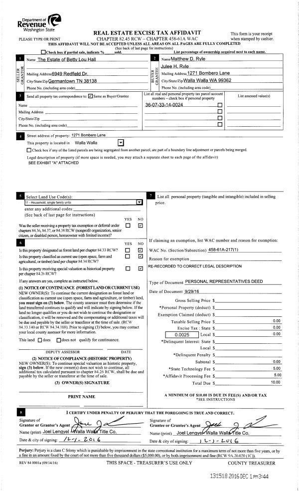 | 1 | 09/29/2016 | DPR | DEED OF PERSONAL REPRESENTATIVE | HULL BETTY LOU ESTATE OF | RYLE MATTHEW D & JULEE H | | | $0.00 | 131518 | 2016-09845 |