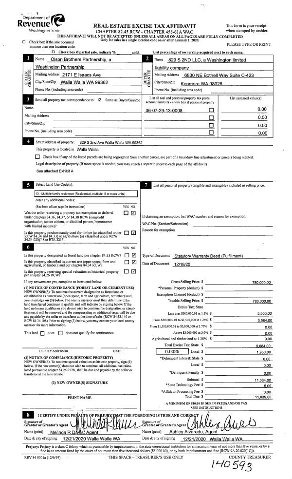 | 2 | 12/21/2020 | REAL ESTAT | REAL ESTATE CONTRACT | OLSON BROTHERS PARTNERSHIP | 829 S 2ND LLC | | | $780,000.00 | 140593 | 2020-13535 |