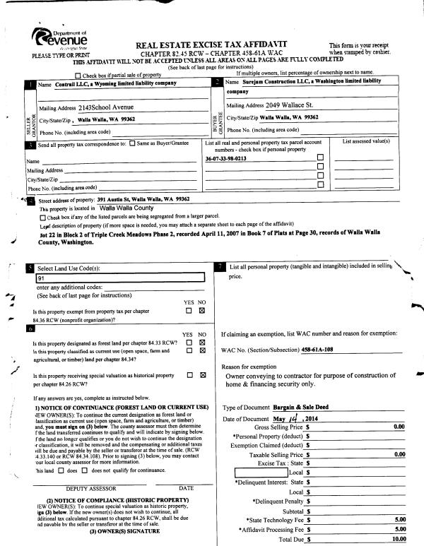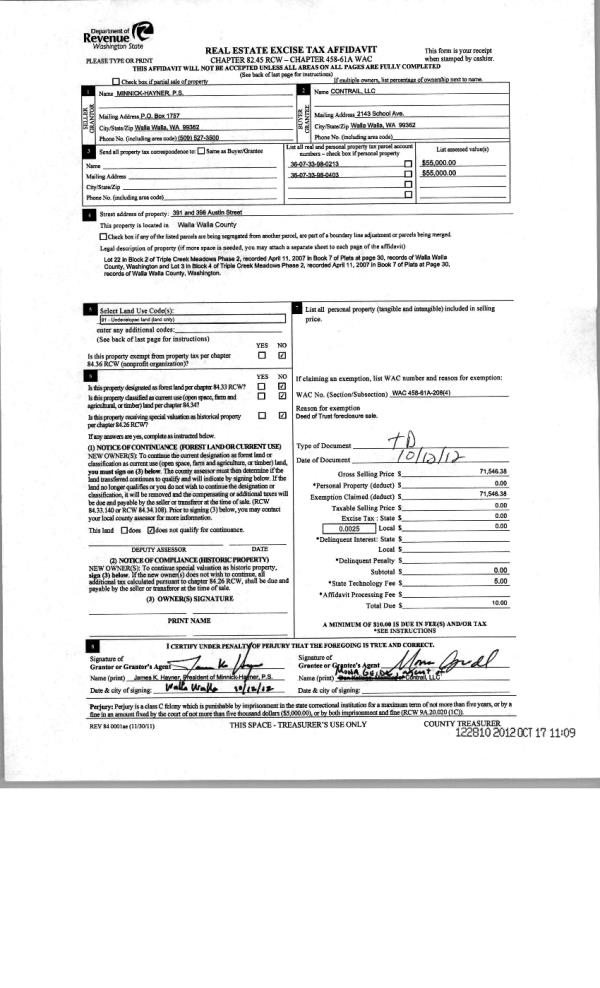 | 4 | 10/17/2012 | WARRANTY D | WARRANTY DEED | MINNICK-HAYNER PS | CONTRAIL LLC | | | $71,546.00 | 122810 | 2012-09124 |