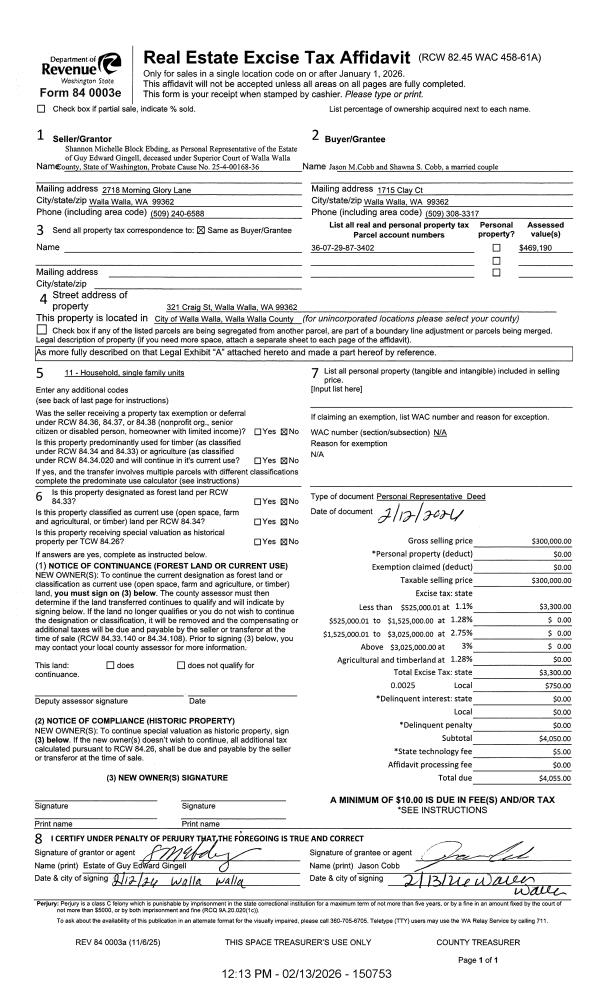 | 1 | 02/13/2026 | DPR | DEED OF PERSONAL REPRESENTATIVE | GINGELL GUY E | COBB JASON M & SHAWNA S | | | $300,000.00 | 150753 | 2026-00890 |