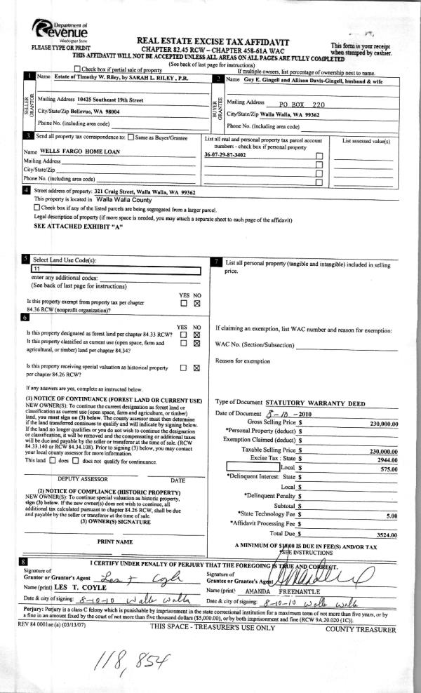 | 3 | 08/11/2010 | WARRANTY D | WARRANTY DEED | RILEY, TIMOTHY ESTATE OF | GINGELL, GUY E | | | $230,000.00 | 118854 | 2010-06212 |
