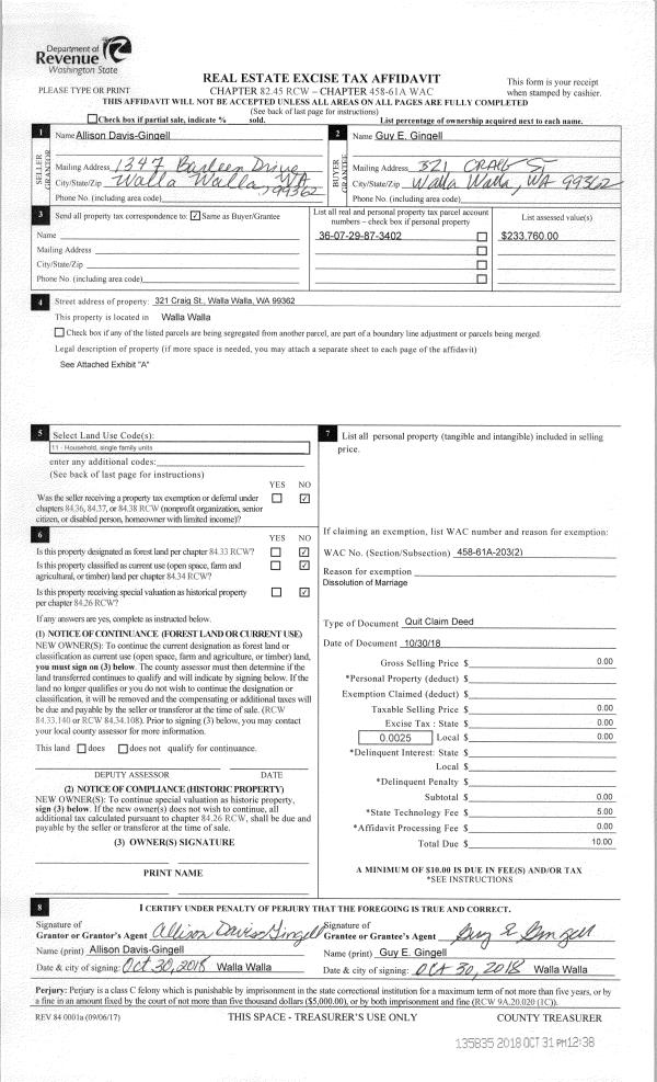 | 1 | 10/30/2018 | QCD | QUIT CLAIM DEED | GINGELL GUY E | GINGELL GUY E | | | $0.00 | 135835 | 2018-09019 |