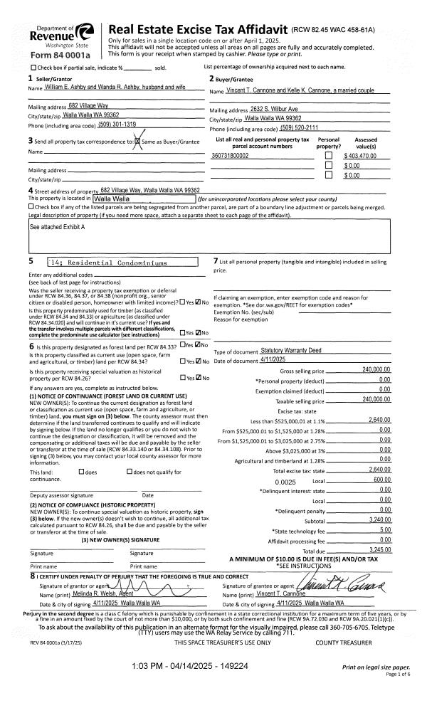 | Mailing Address: | 682 VILLAGE WAY WALLA WALLA, WA 99362 | % Ownership: | 100.0000000000% |