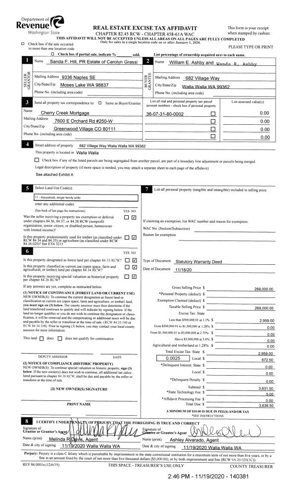 | 2 | 11/19/2020 | SWD | STATUTORY WARRANTY DEED | GRASSI CAROLYN ESTATE OF | ASHBY WILLIAM E & WANDA R | | | $269,000.00 | 140381 | 2020-12251 |
