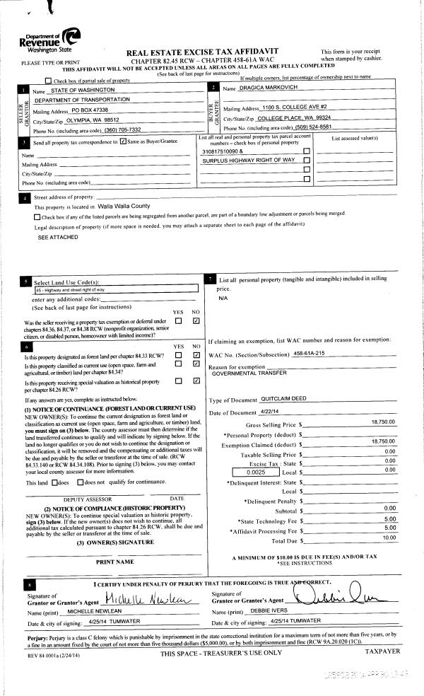 | 3 | 04/30/2014 | QCD | QUIT CLAIM DEED | WASHINGTON STATE OF | MARKOVICH DRAGICA | | | $18,750.00 | 125802 | 2014-02940 |