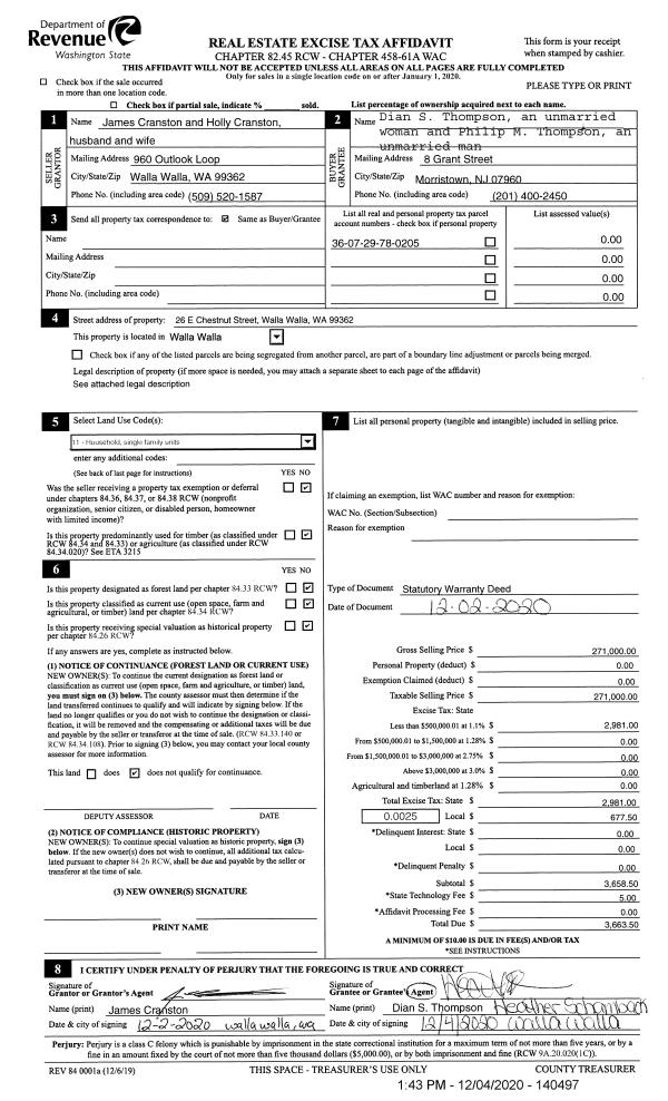 | 2 | 12/04/2020 | SWD | STATUTORY WARRANTY DEED | CRANSTON HOLLY & JAMES CRANSTON III | THOMPSON DIAN S | | | $271,000.00 | 140497 | 2020-12882 |