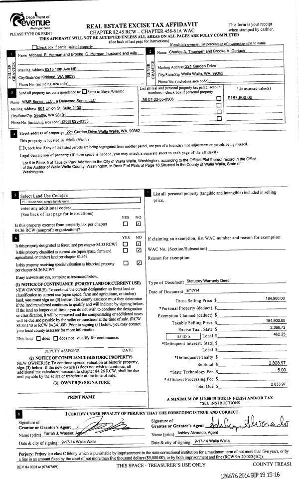 | 2 | 09/17/2014 | SWD | STATUTORY WARRANTY DEED | HERMAN MICHAEL P & BROOKE G | THOMSEN CHARLES A | | | $184,900.00 | 126676 | 2014-06890 |