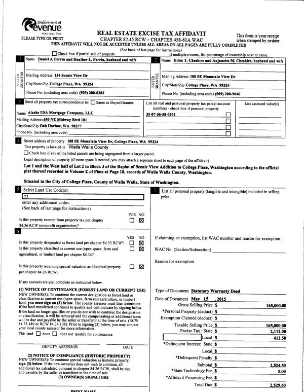 | 1 | 05/19/2015 | SWD | STATUTORY WARRANTY DEED | PERRIN DANIEL J & HEATHER L | CHESHIRE EDUA T & ANJANETTE M | | | $165,000.00 | 128013 | 2015-04260 |