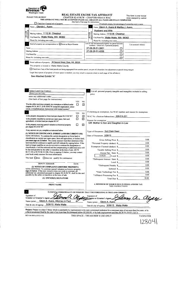 | 2 | 05/26/2015 | QCD | QUIT CLAIM DEED | AYERS GLENDA MRS | AYERS GLENN A & MARTHA J | 2 PARCELS | | | 128041 | 2015-04452 |