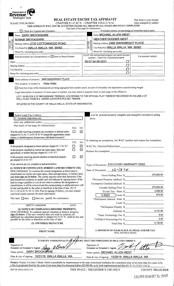 | 2 | 10/31/2016 | SWD | STATUTORY WARRANTY DEED | BROOKSHIRE GARY & BONNIE | WEST MICHAEL ALLEN & HEATHER DODDER | | | $270,000.00 | 131359 | 2016-09021 |