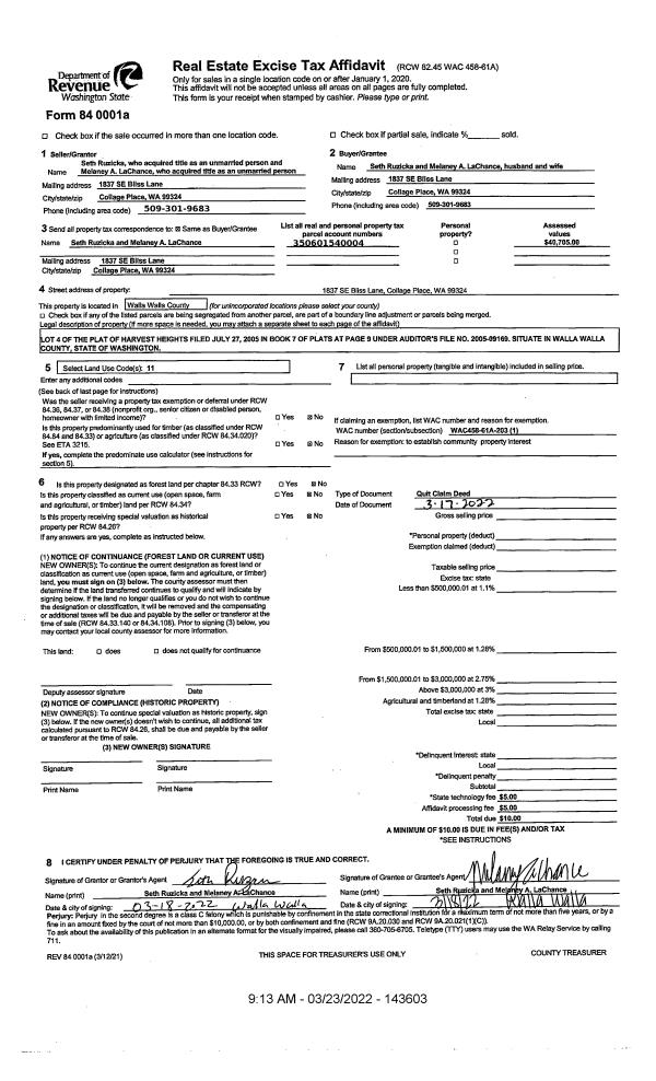 | 1 | 03/17/2022 | QCD | QUIT CLAIM DEED | RUZICKA SETH | RUZICKA SETH & MELANEY A LA CHANCE | | | $0.00 | 143603 | 2022-02404 |
