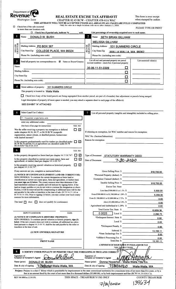 | 2 | 07/31/2020 | SWD | STATUTORY WARRANTY DEED | BUSH DONALD W | GILLHAM SETH B & MELISSA K | | | $918,700.00 | 139634 | 2020-07486 |
