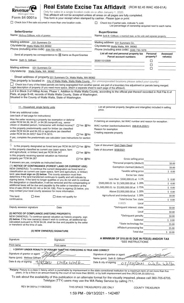 | 1 | 09/13/2021 | QCD | QUIT CLAIM DEED | GILLHAM SETH B & MELISSA K | GILLHAM SETH B | | | $0.00 | 142487 | 2021-11258 |