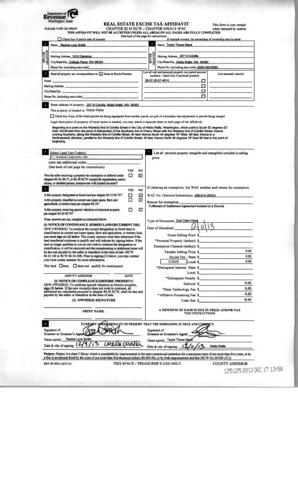 | 4 | 12/17/2013 | QCD | QUIT CLAIM DEED | MACE TAYLOR | MACE TAYLOR THENE | | | | 125125 | 2013-12038 |