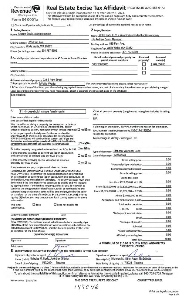 | 1 | 01/22/2024 | WARRANTY D | WARRANTY DEED | DAVIS ANDREW | 223 S PARK LLC | | | | 147046 | 2024-00338 |