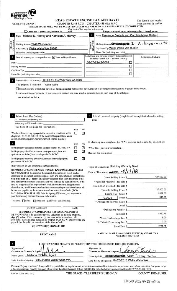 | 1 | 04/23/2018 | SWD | STATUTORY WARRANTY DEED | HARVEY MICHAEL D & KATHLEEN A | DIETSCH FERNANDO | | | $127,500.00 | 134549 | 2018-03167 |