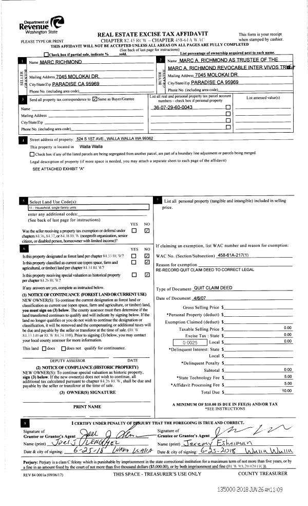 | 2 | 06/25/2018 | QCD | QUIT CLAIM DEED | RICHMOND MARC | RICHMOND MARC REV INTER VIVOS TRUST | | | $0.00 | 135000 | 2018-05127 |