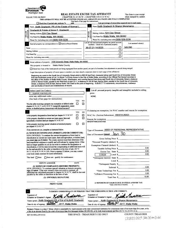 | 3 | 01/30/2017 | DPR | DEED OF PERSONAL REPRESENTATIVE | GRADWOHL NORMAN L & ANNE E | GRADWOHL KEITH | | | $0.00 | 131833 | 2017-00819 |