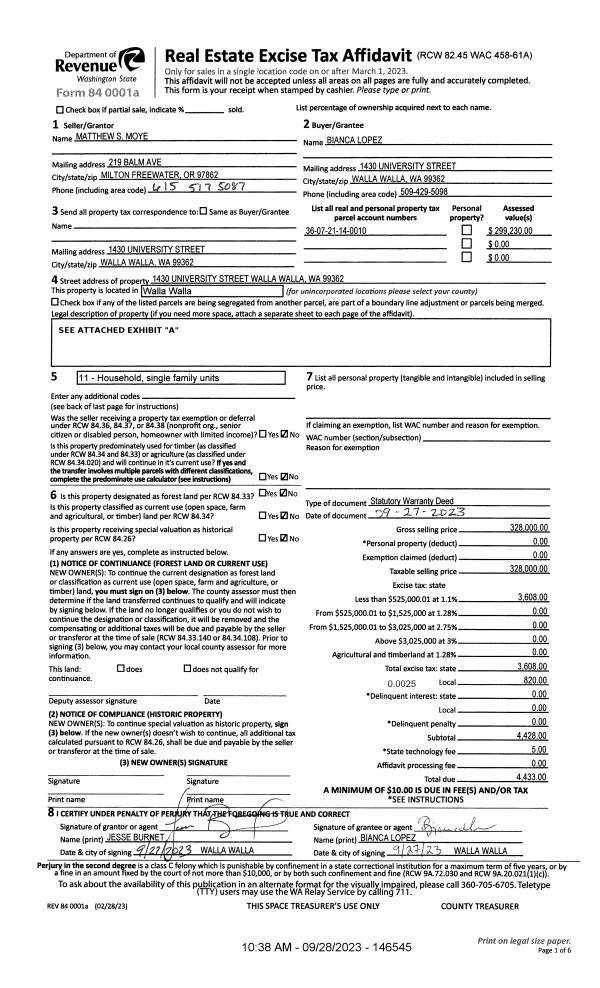 | 1 | 09/28/2023 | SWD | STATUTORY WARRANTY DEED | MOYE MATTHEW S | LOPEZ BIANCA A | | | $328,000.00 | 146545 | 2023-05675 |