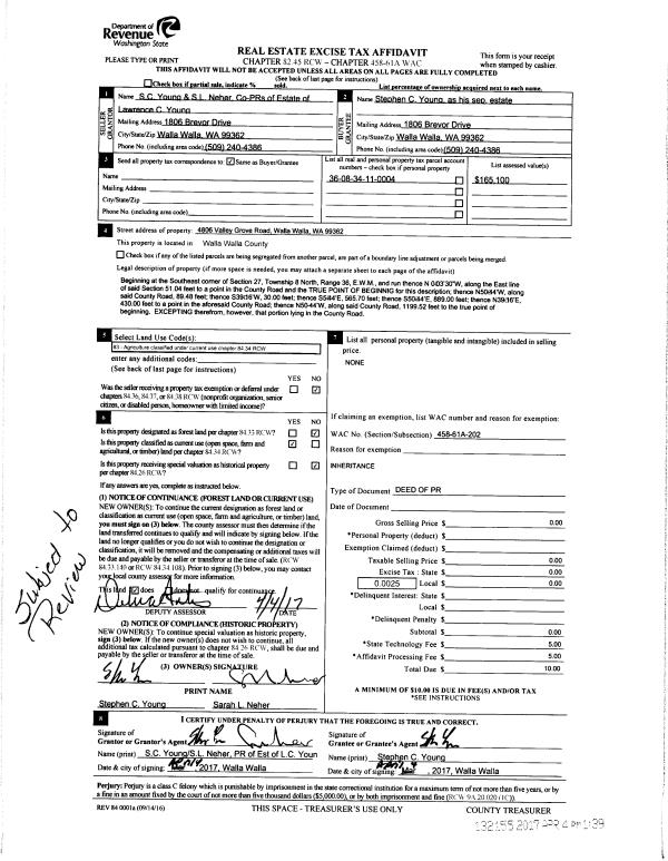 | 1 | 04/04/2017 | DPR | DEED OF PERSONAL REPRESENTATIVE | YOUNG LAWRENCE C | YOUNG STEPHEN C | | | -$165,100.00 | 132155 | 2017-02543 |