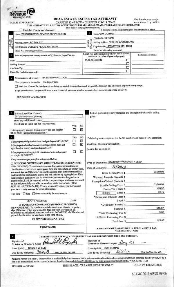 | 2 | 03/21/2013 | WARRANTY D | WARRANTY DEED | WHITMAN DEVELOPMENT CORP | OLTMAN, GUY & PAULA M | | | $33,900.00 | 123646 | 2013-02649 |