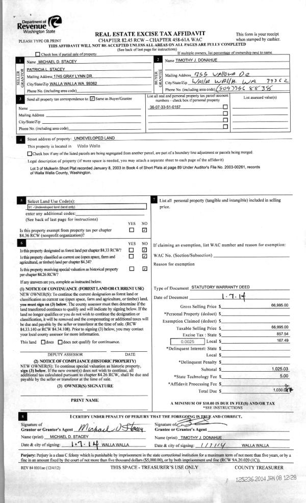 | 2 | 01/08/2014 | SWD | STATUTORY WARRANTY DEED | STACEY MICHAEL D & PATRICIA | DONAHUE TIMOTHY J | | | $66,995.00 | 125236 | 2014-00145 |