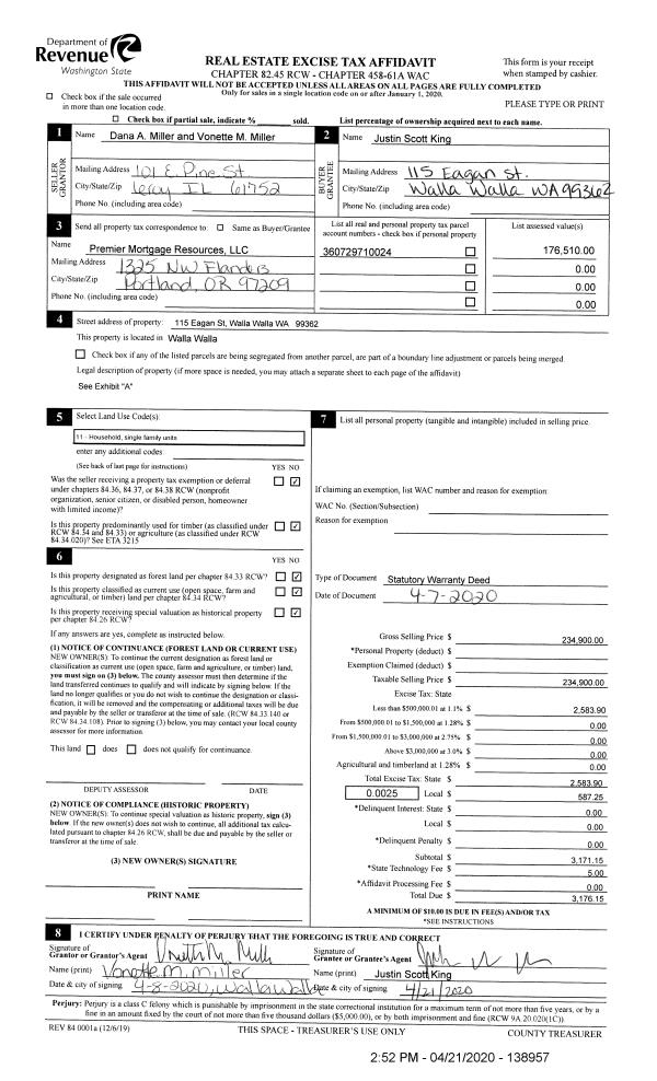 | 1 | 04/21/2020 | SWD | STATUTORY WARRANTY DEED | MILLER DANA A & VONETTE M | KING JUSTIN SCOTT | | | $234,900.00 | 138957 | 2020-03403 |