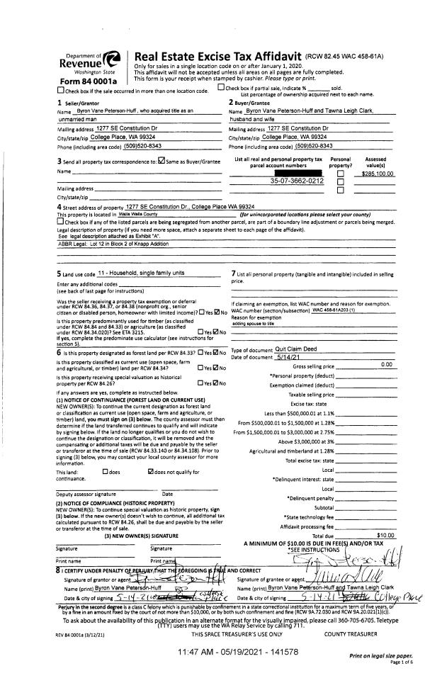 | 1 | 05/14/2021 | QCD | QUIT CLAIM DEED | PETERSON-HUFF BYRON | PETERSON HUFF BURON VANE & TAWNA LEIGH CLARK | | | $0.00 | 141578 | 2021-06059 |