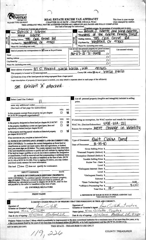 | 2 | 10/21/2010 | QCD | QUIT CLAIM DEED | GILLETTE, PATRICK J & NINA | GILLETTE FAMILY TRUST | | | | 119226 | 2010-08503 |