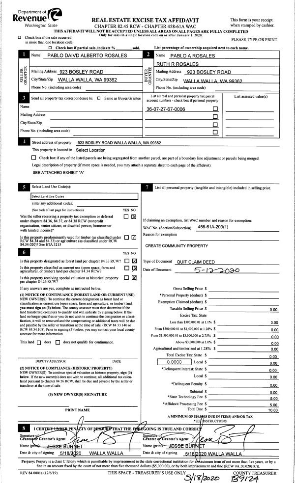 | 1 | 05/18/2020 | QCD | QUIT CLAIM DEED | ROSALES PABLO DAVID ALBERTO | ROSALES PABLO DAVID ALBERTO | | | $0.00 | 139124 | 2020-04344 |