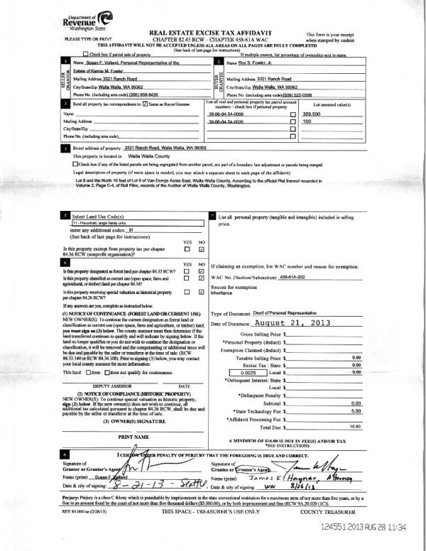 | 2 | 08/28/2013 | WARRANTY D | WARRANTY DEED | FOWLER, KARMA M ESTATE OF | FOWLER, ROY S JR | | | $0.00 | 124551 | 2013-08854 |