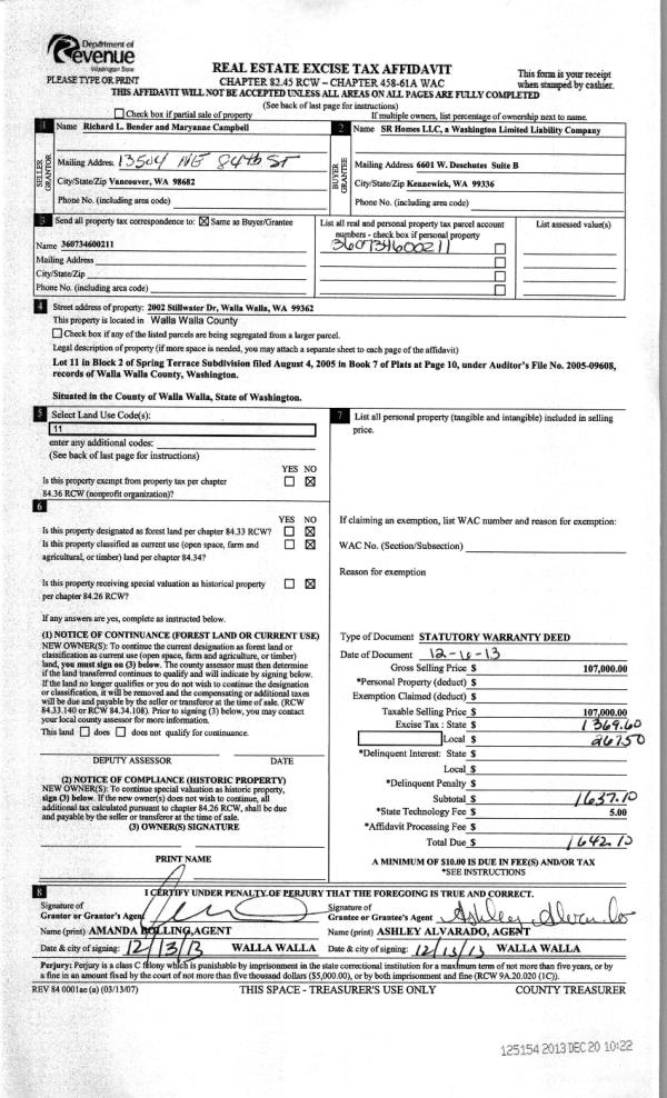 | 2 | 12/20/2013 | WARRANTY D | WARRANTY DEED | BENDER RICHARD L | SR HOMES LLC | | | $107,000.00 | 125154 | 2013-12150 |