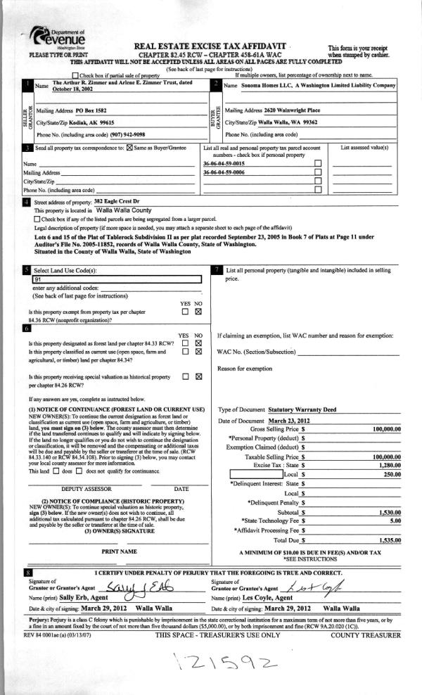 | 4 | 03/29/2012 | WARRANTY D | WARRANTY DEED | ZIMMER ARTHUR R & ARLENE E TRUSTEES OF THE | SONOMA HOMES LLC | | | $100,000.00 | 121592 | 2012-02548 |