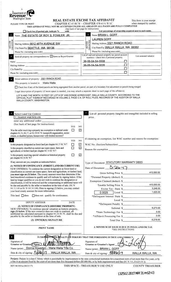 | 1 | 05/31/2017 | SWD | STATUTORY WARRANTY DEED | FOWLER ROY S JR ESTATE OF | GOFF BRIAN L & LAUREN | | 2-PARCELS | $410,000.00 | 132502 | 2017-04134 |