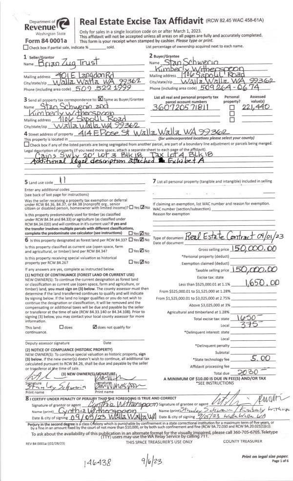 | 1 | 09/06/2023 | REAL ESTAT | REAL ESTATE CONTRACT | WITHERSPOON CYNTHIA K AS TRUSTEE | SCHWERIN STANLEY | | | $150,000.00 | 146438 | 2023-05170 |