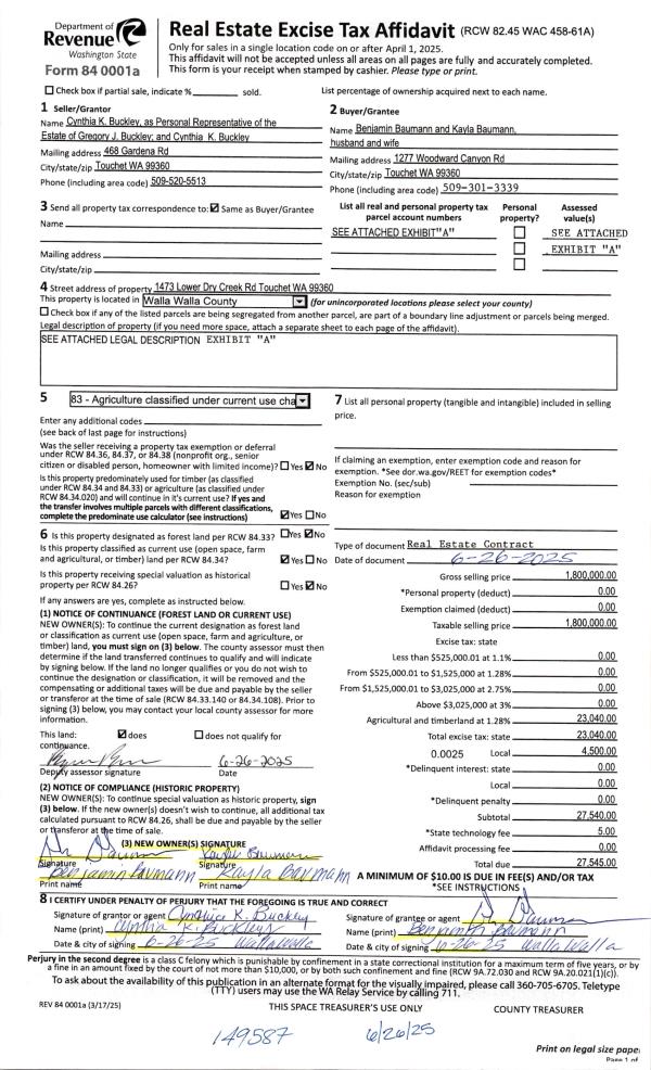 | 1 | 06/26/2025 | REAL ESTAT | REAL ESTATE CONTRACT | BUCKLEY GREGORY J & CYNTHIA K | BAUMANN BENJAMIN & KAYLA | | 6-PARCELS | $1,800,000.00 | 149587 | 2025-03618 |