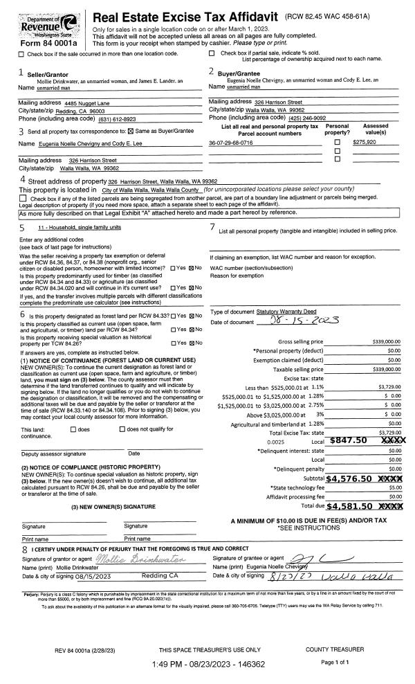 | 2 | 08/23/2023 | SWD | STATUTORY WARRANTY DEED | DRINKWATER MOLLIE | CHEVIGNY EUGENIA NOELLE | | | $339,000.00 | 146362 | 2023-04891 |