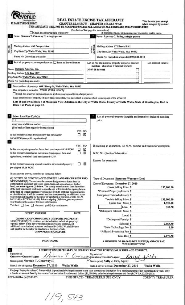 | 2 | 12/30/2010 | WARRANTY D | WARRANTY DEED | CONAWAY, NORMAN T II | BAILEY, LYNNSEY C | | | $135,000.00 | 119543 | 2010-10843 |