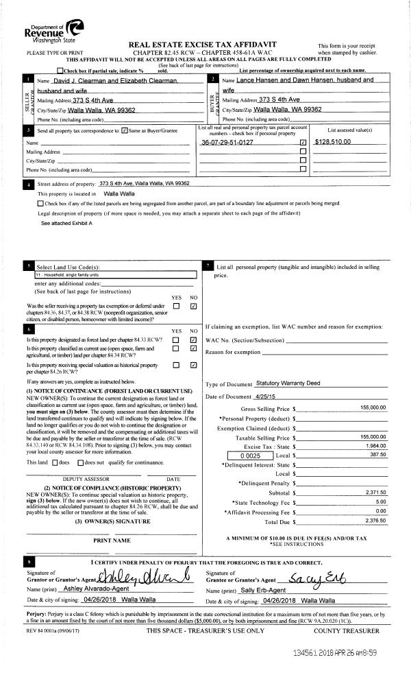 | 3 | 04/26/2018 | SWD | STATUTORY WARRANTY DEED | CLEARMAN DAVID J & ELIZABETH W | HANSEN LANCE & DAWN | | | $155,000.00 | 134561 | 2018-03228 |
