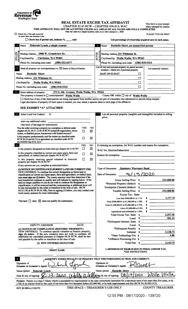 | 1 | 08/17/2020 | SWD | STATUTORY WARRANTY DEED | LYNCH DEBORAH | SHORT ROCHELLE | | | $232,500.00 | 139720 | 2020-08175 |