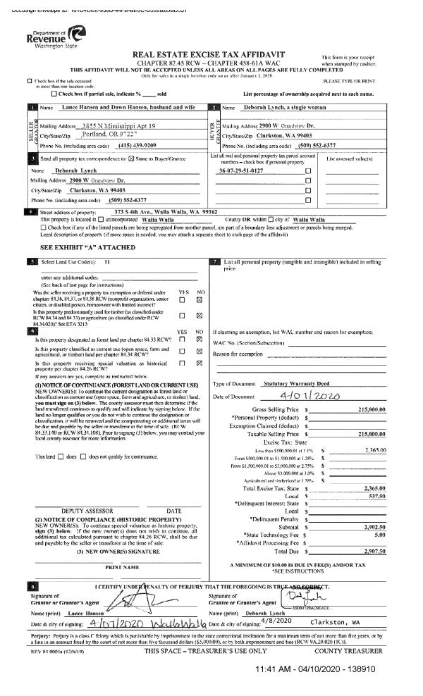 | 2 | 04/10/2020 | SWD | STATUTORY WARRANTY DEED | HANSEN LANCE & DAWN | LYNCH DEBORAH | | | $215,000.00 | 138910 | 2020-03078 |