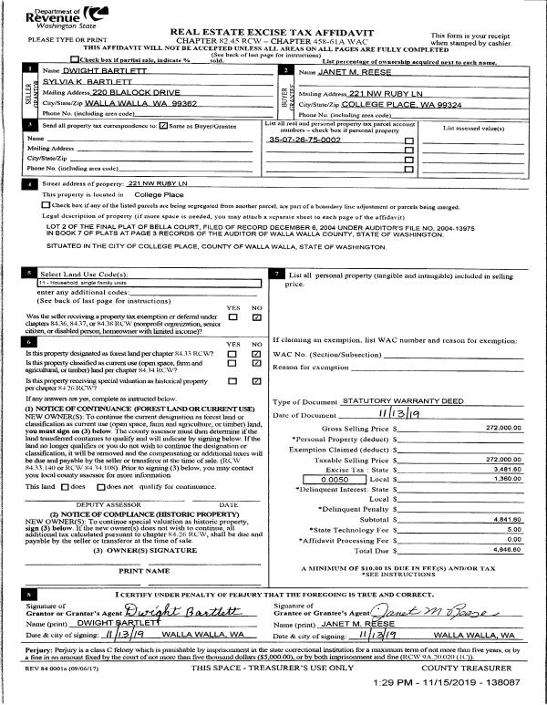 | 2 | 11/15/2019 | SWD | STATUTORY WARRANTY DEED | BARTLETT DWIGHT & SYLVIA K | REESE JANET M | | | $272,000.00 | 138087 | 2019-09444 |