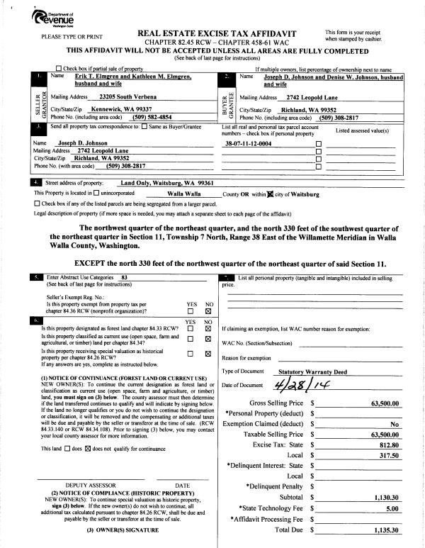 | 3 | 05/01/2014 | SWD | STATUTORY WARRANTY DEED | ELMGREN ERIK THOMAS & KATHLEEN MARIE | JOHNSON JOSEPH D & DENISE W | | | $63,500.00 | 125811 | 2014-02978 |