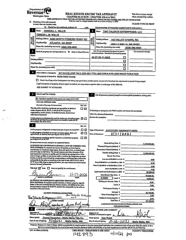 | 1 | 11/17/2021 | SWD | STATUTORY WARRANTY DEED | WILLIS RANDALL L & TERESA L M | TWO TALENTS ENTERPRISES LLC | | | $2,100,000.00 | 142893 | 2021-13710 |