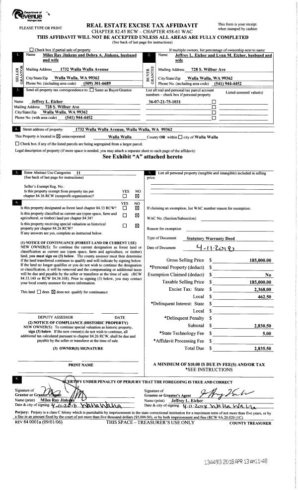 | 2 | 04/13/2018 | SWD | STATUTORY WARRANTY DEED | JINKENS MILES R & DEBRA A | EICHER JEFFREY L & LYNN M | | | $185,000.00 | 134493 | 2018-02861 |