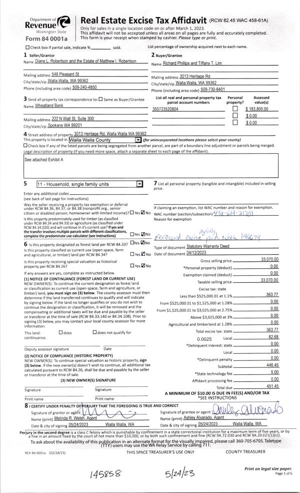 | 1 | 04/12/2023 | SWD | STATUTORY WARRANTY DEED | ROBERTSON DIANE L | PHILLIPS RICHARD | | | $33,070.00 | 145858 | 2023-02798 |