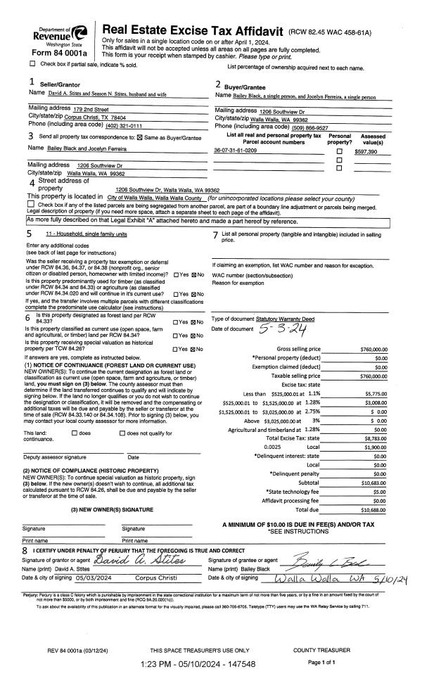 | 1 | 05/10/2024 | SWD | STATUTORY WARRANTY DEED | STITES DAVID A & SEASON N | BLACK BAILEY | | 2 PARCELS | $760,000.00 | 147548 | 2024-02504 |