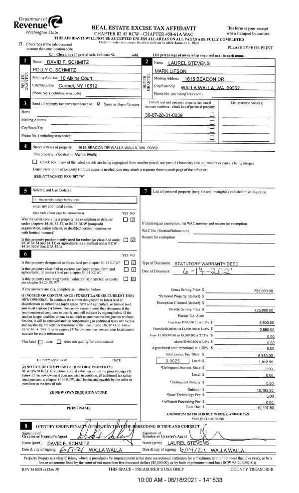| 1 | 06/18/2021 | SWD | STATUTORY WARRANTY DEED | SCHMITZ DAVID F | STEVENS LAUREL & MARK LIFSON | | | $725,000.00 | 141833 | 2021-07433 |